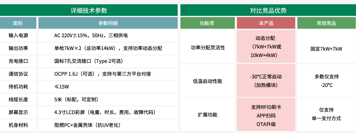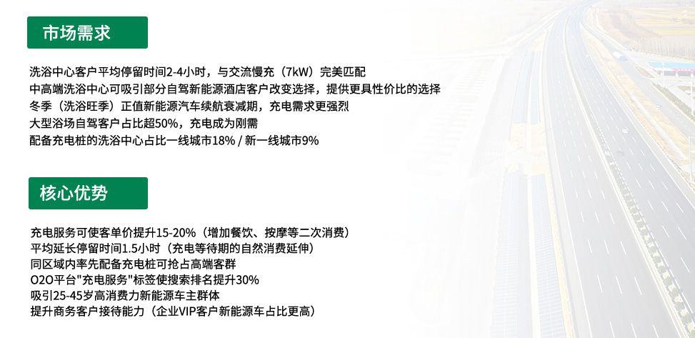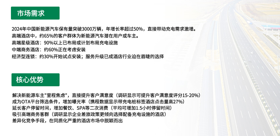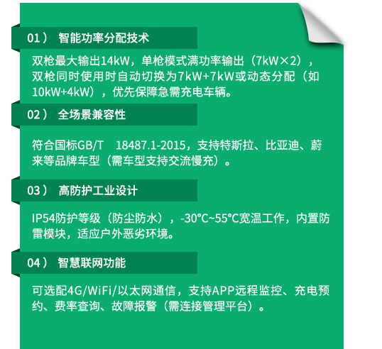 充九九14kW双枪交流充电桩是面向酒店、民宿、洗浴中心等可提供留宿及需要长时长泊车等场景设计的智能充电设备,支持双枪轮充或同时充电(功率动态分配),兼容主流新能源车型,满足需长时长且离车补能需求的用户场景使用,为业主企业提供服务赋能,提升客户消费体验,增加客户粘性!
